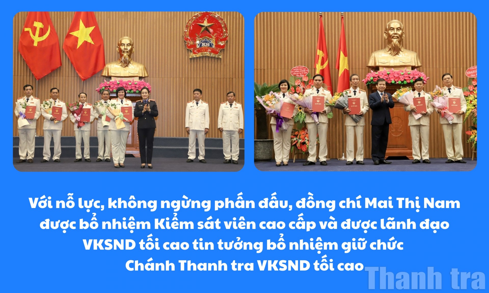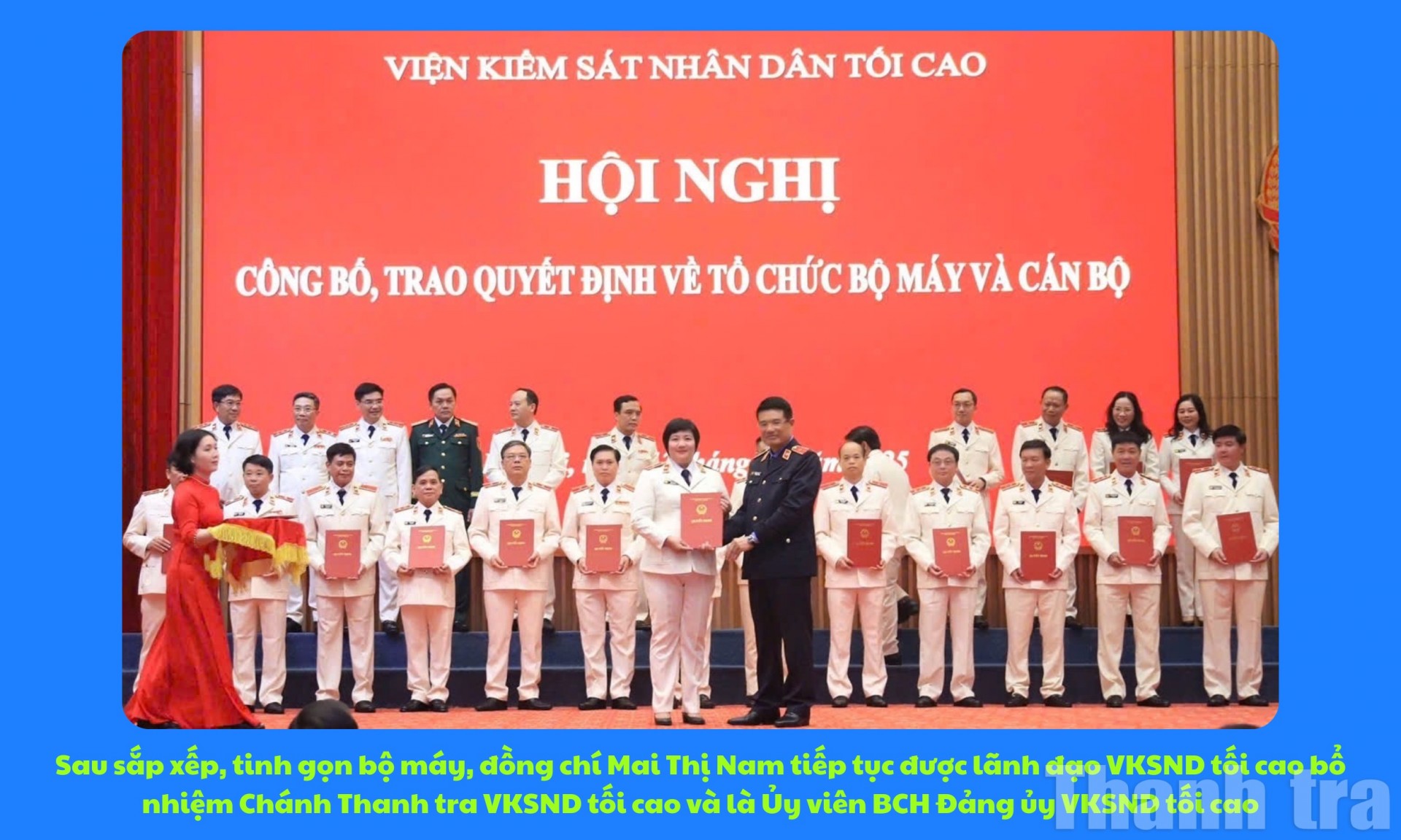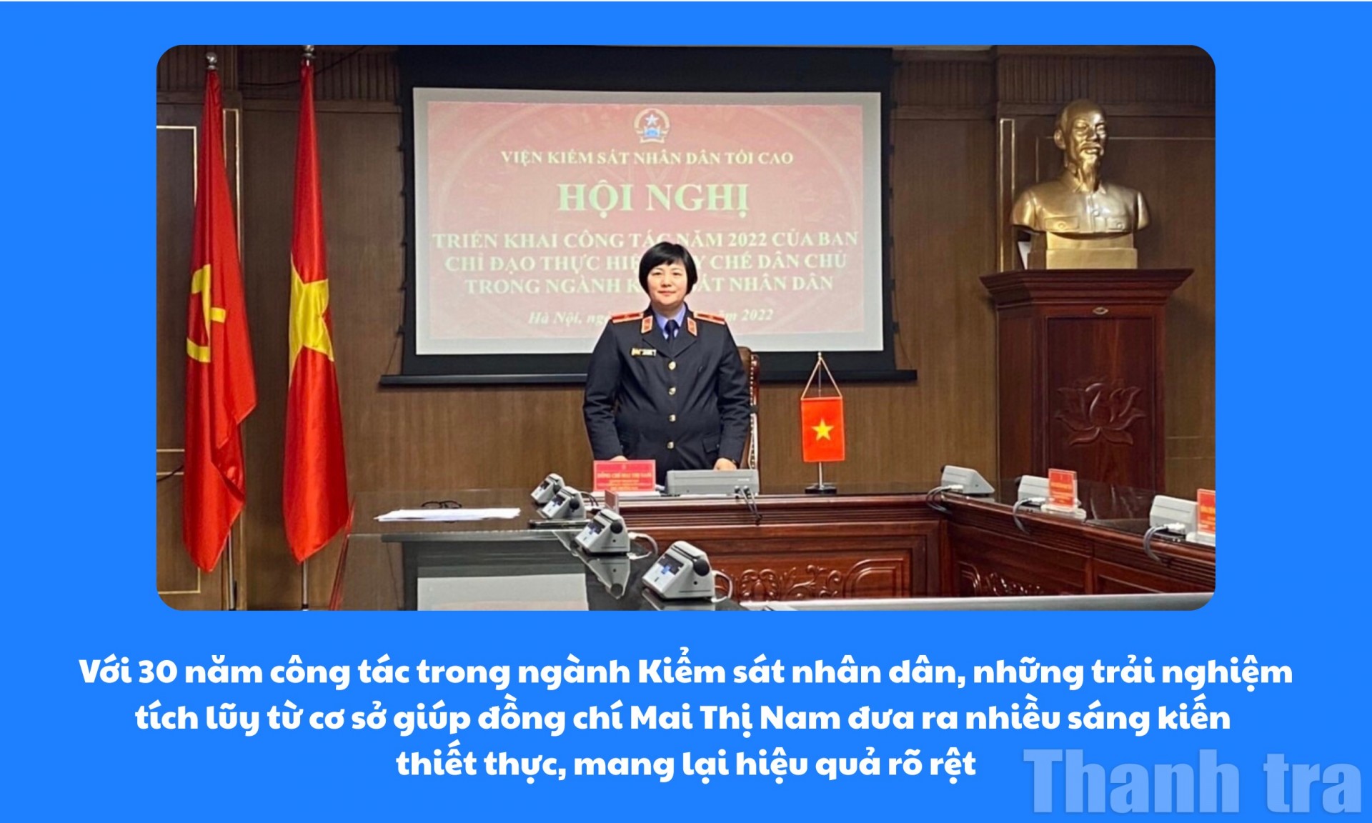 Với những sáng kiến, giải pháp xuất phát từ thực tiễn và được triển khai thống nhất trong toàn ngành Kiểm sát, góp phần cải tiến quy trình thanh tra, tăng cường giám sát sau thanh tra, đồng thời từng bước số hóa công tác xử lý đơn thư…, bà Mai Thị Nam, Chánh Thanh tra VKSND tối cao, được đồng nghiệp ghi nhận là một lãnh đạo tận tâm, gần gũi, luôn truyền cảm hứng bằng chính sự bền bỉ và tinh thần trách nhiệm trong công việc.