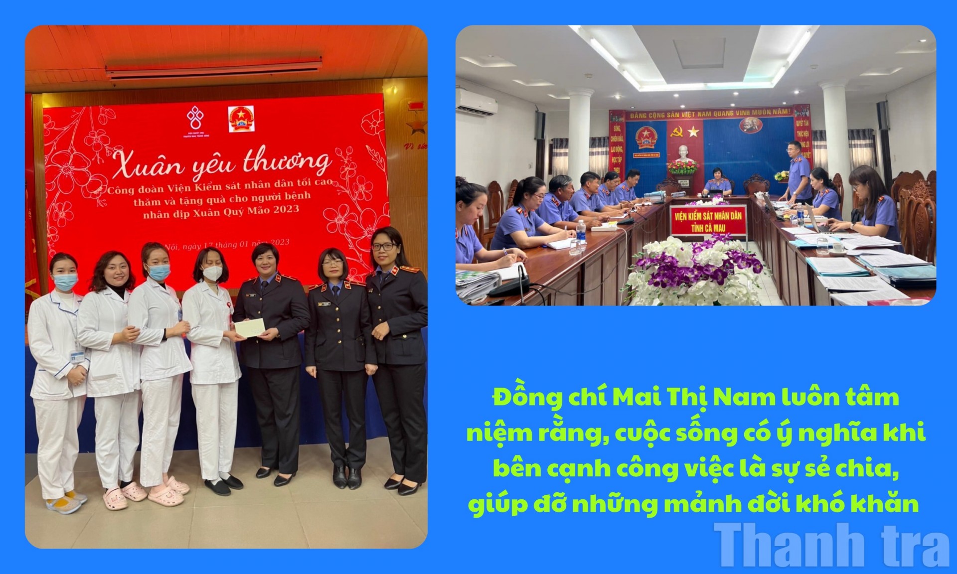 Chánh Thanh tra Mai Thị Nam luôn tâm niệm rằng, cuộc sống có ý nghĩa khi bên cạnh công việc là sự sẻ chia, giúp đỡ những mảnh đời khó khăn. Từ suy nghĩ ấy, bà đã cụ thể hoá tinh thần nhân ái thành hành động thiết thực. Sự quan tâm ấy không chỉ tạo nên một môi trường làm việc ấm áp, gắn bó mà còn lan tỏa tình yêu thương và niềm tin đến những người xung quanh. Với đồng chí, câu nói “hạnh phúc là được cho đi” không chỉ là lời nhắc nhở, mà đã trở thành lẽ sống thường ngày.
