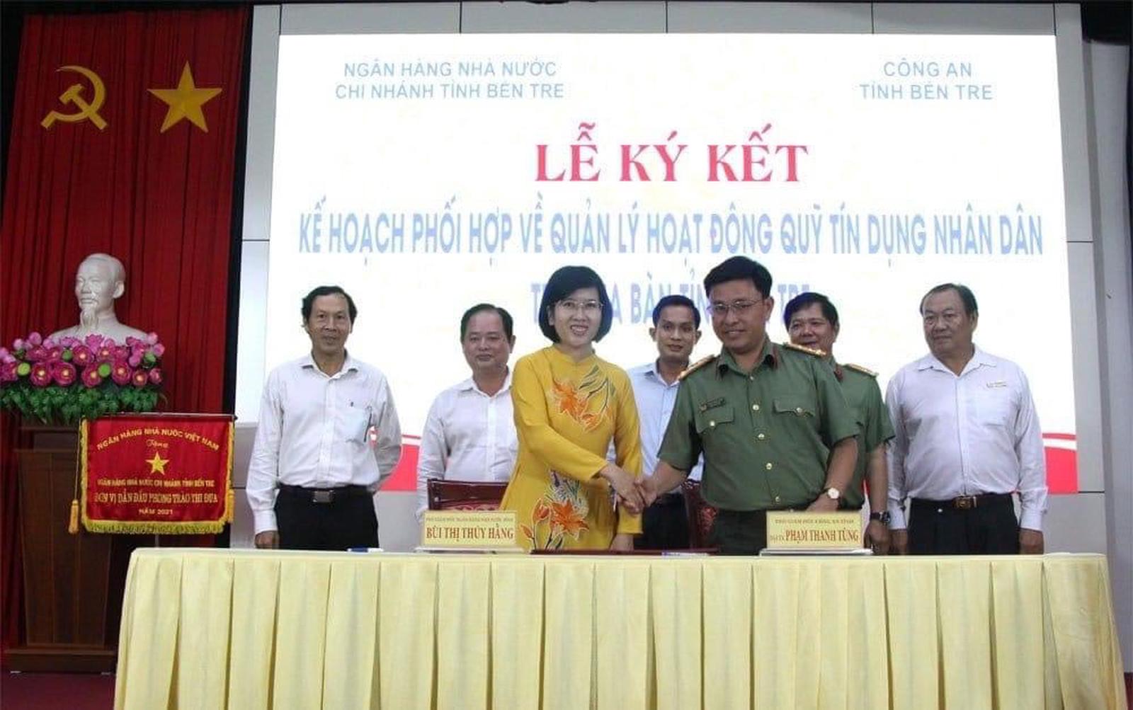 Chi nhánh Ngân hàng Nhà nước Bến Tre (cũ) ký kết hợp tác với Công an tỉnh về công tác phối hợp hoạt động quỹ tín dụng nhân dân. Ảnh: NVCC