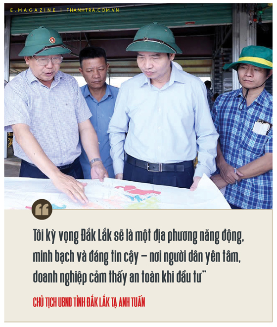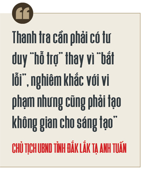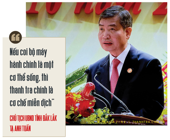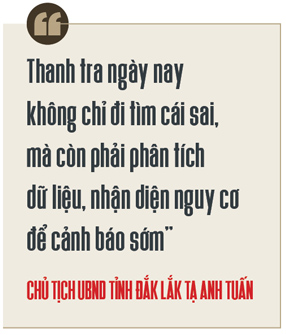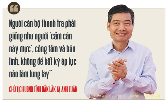-Ông Tạ Anh Tuấn: Trong thời gian tới, tỉnh Đắk Lắk xác định công tác thanh tra tiếp tục là một nhiệm vụ trọng tâm. Thanh tra không chỉ là hoạt động “đi tìm cái sai” hay “xử lý sau vi phạm”, mà quan trọng hơn là biện pháp hữu hiệu nhằm bảo đảm kỷ cương, kỷ luật hành chính, ngăn ngừa từ sớm, từ xa những biểu hiện tiêu cực, tham nhũng, lãng phí; đồng thời, khuyến khích, thúc đẩy đổi mới, sáng tạo trong bộ máy hành chính.
