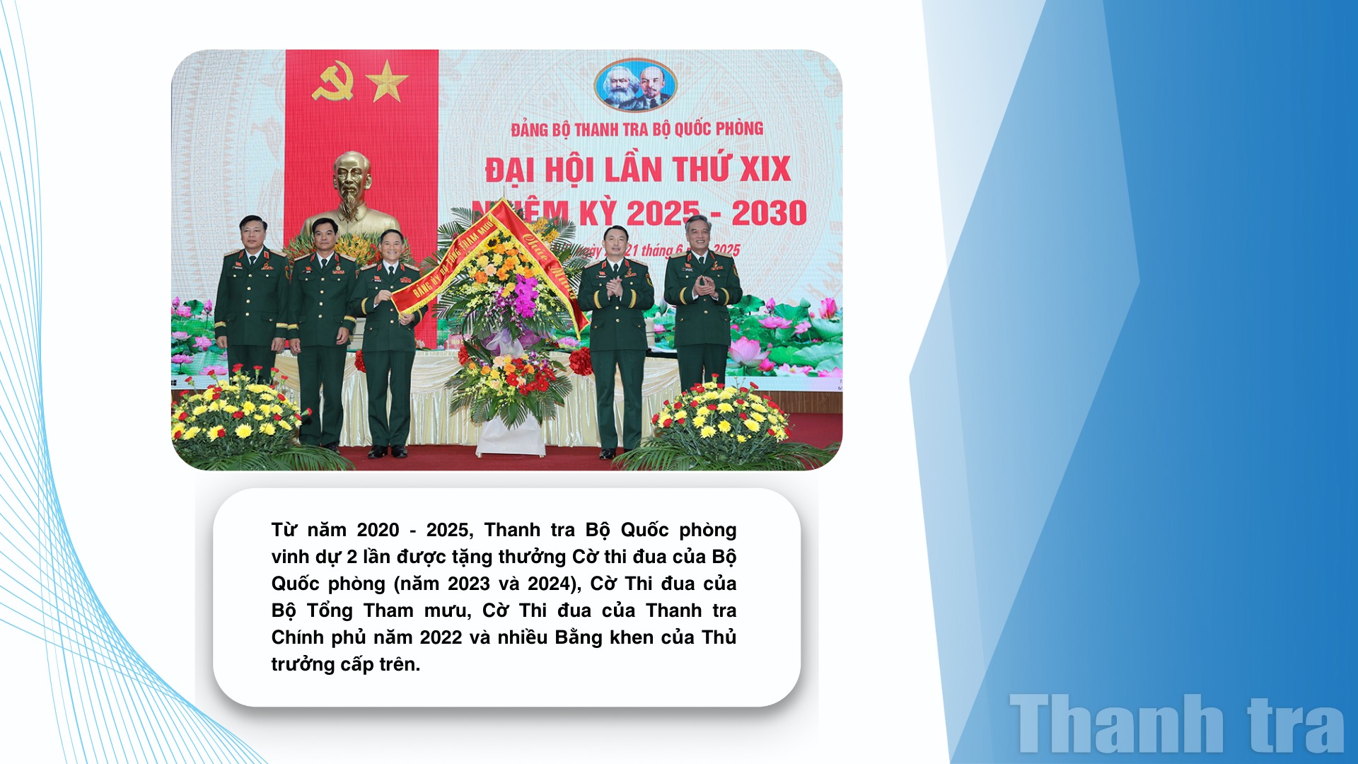 Suốt nhiệm kỳ, Đảng bộ luôn kiên định trong việc xây dựng cơ quan vững mạnh về chính trị, tư tưởng, tổ chức, đạo đức và cán bộ, hướng tới mục tiêu xây dựng cơ quan vững mạnh toàn diện "Mẫu mực, tiêu biểu". Sự nỗ lực không ngừng này đã được đền đáp xứng đáng bằng nhiều phần thưởng cao quý: Thanh tra Bộ Quốc phòng vinh dự 2 lần được tặng thưởng Cờ thi đua của Bộ Quốc phòng (năm 2023 và 2024), Cờ Thi đua của Bộ Tổng Tham mưu, Cờ Thi đua của Thanh tra Chính phủ năm 2022 và nhiều Bằng khen của Thủ trưởng cấp trên. Những danh hiệu này không chỉ là sự ghi nhận cho những thành tích xuất sắc mà còn là nguồn động viên to lớn, khẳng định uy tín và chất lượng hoạt động của Đảng bộ và toàn ngành Thanh tra Quốc phòng.