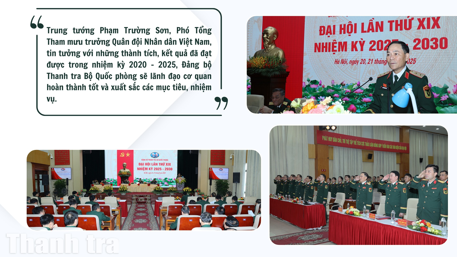 Ghi nhận những thành tích và kết quả nổi bật mà Đảng bộ Thanh tra Bộ Quốc phòng đã đạt được trong nhiệm kỳ qua, Trung tướng Phạm Trường Sơn, Phó Tổng Tham mưu trưởng Quân đội Nhân dân Việt Nam, nhấn mạnh nhiệm vụ đặt ra với Đảng bộ Thanh tra Bộ Quốc phòng trong nhiệm kỳ 2025 - 2030 là hết sức nặng nề, đòi hỏi sự nỗ lực vượt bậc, tinh thần đoàn kết và thống nhất cao độ của toàn Đảng bộ. Tuy nhiên, với những thành tích và kết quả đã đạt được trong nhiệm kỳ qua, Trung tướng Phạm Trường Sơn tin tưởng Đảng bộ Thanh tra Bộ Quốc phòng sẽ tiếp tục phát huy truyền thống vẻ vang, lãnh đạo cơ quan hoàn thành tốt và xuất sắc các mục tiêu, nhiệm vụ.