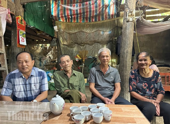 Từ bên phải qua: Anh Đinh Quang Vũ (nguyên Chủ tịch UBND xã Hồng Định); ông Đinh Văn Nghiệp – bố đẻ anh Đinh Văn Vụ; ông Đinh Văn Hà (nguyên Trưởng xóm); bà Đàm Thị Trường – mẹ đẻ anh Định Văn Vụ, những người luôn sát cánh và luôn hào hứng khi nói sự quyết tâm thoát nghèo bằng con đường học tập, để rồi có cơ hội công hiến, xây dựng quê hương. Ảnh: Phi Thu