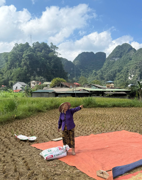 Với nụ cười rạng rỡ, bà Nông Thị Xít, xóm Bó Puôn, rất phấn khởi chỉ đường tới hang Ngườm Á, hang núi trong câu chuyện lên hang ôn thi. Ảnh: Phi Thu