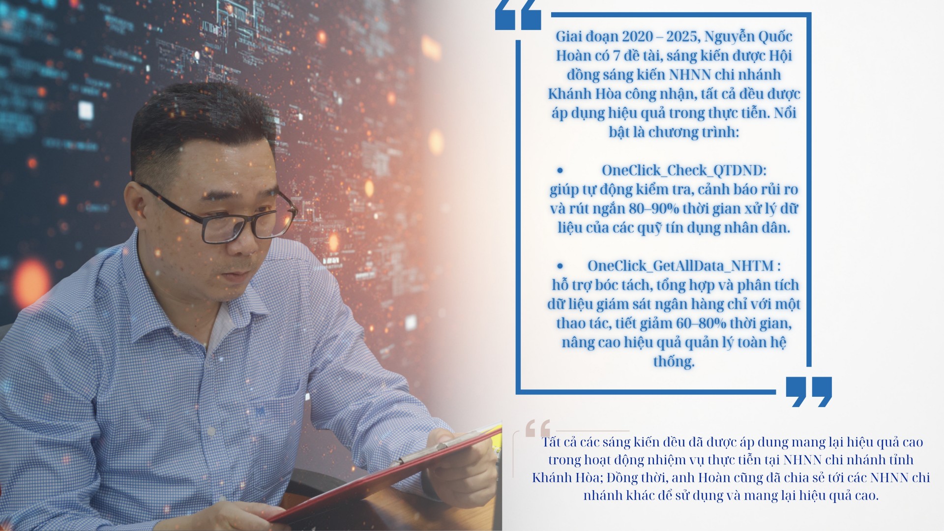 Thời đại chuyển đổi số đang làm thay đổi mọi quy trình, và công tác thanh tra cũng không nằm ngoài vòng xoáy đó. Với tư duy đổi mới, anh Nguyễn Quốc Hoàn đưa công nghệ thông tin vào công tác thanh tra, giám sát, giúp tăng độ chính xác, giảm khối lượng công việc tới 60%. Từ các ý tưởng nảy sinh trong những đêm làm việc muộn, anh đã tự tay thiết kế công cụ kiểm tra, đối chiếu dữ liệu kế toán, phần mềm tự động hóa việc kiểm tra báo cáo của toàn bộ các tổ chức tín dụng trên địa bàn.
