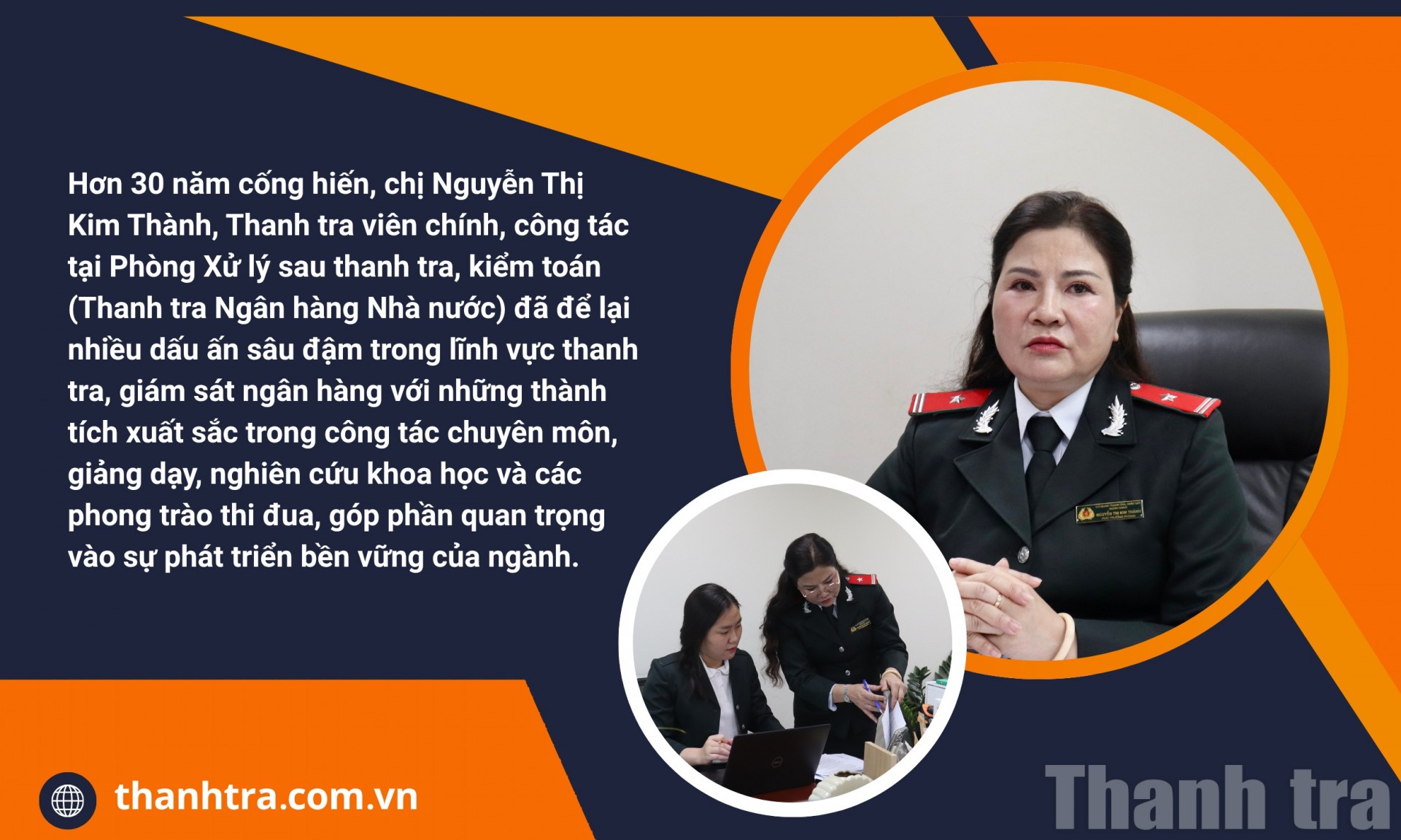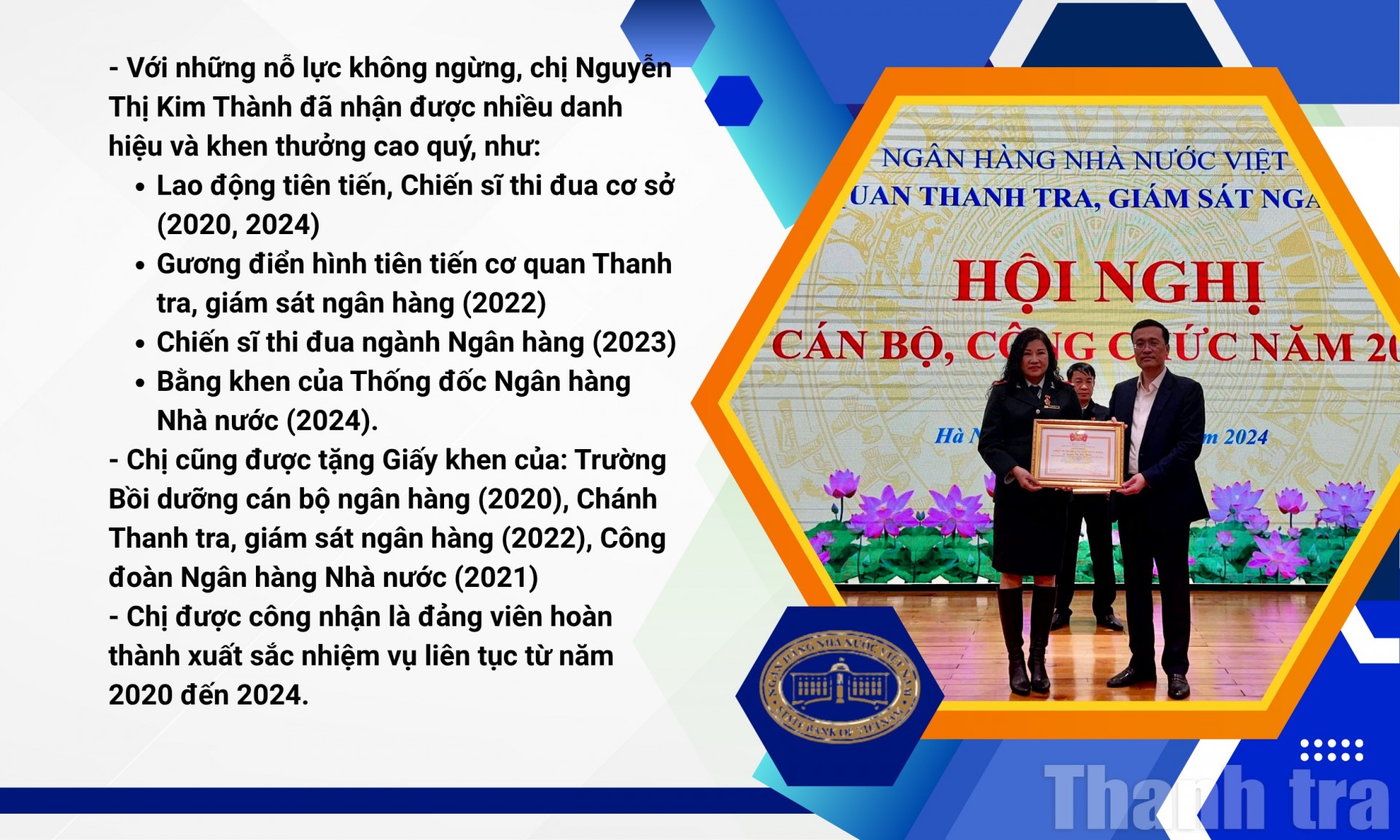 Chị Nguyễn Thị Kim Thành là một tấm gương điển hình tiên tiến, tiêu biểu cho tinh thần cống hiến, trách nhiệm và sáng tạo của Thanh tra Ngân hàng Nhà nước. Những thành tích của chị không chỉ là niềm tự hào của cá nhân mà còn là nguồn cảm hứng cho đồng nghiệp và thế hệ trẻ noi theo. Với tâm huyết và sự tận tụy, chị Thành đã và đang góp phần quan trọng vào sự phát triển bền vững của ngành Thanh tra Ngân hàng Việt Nam.