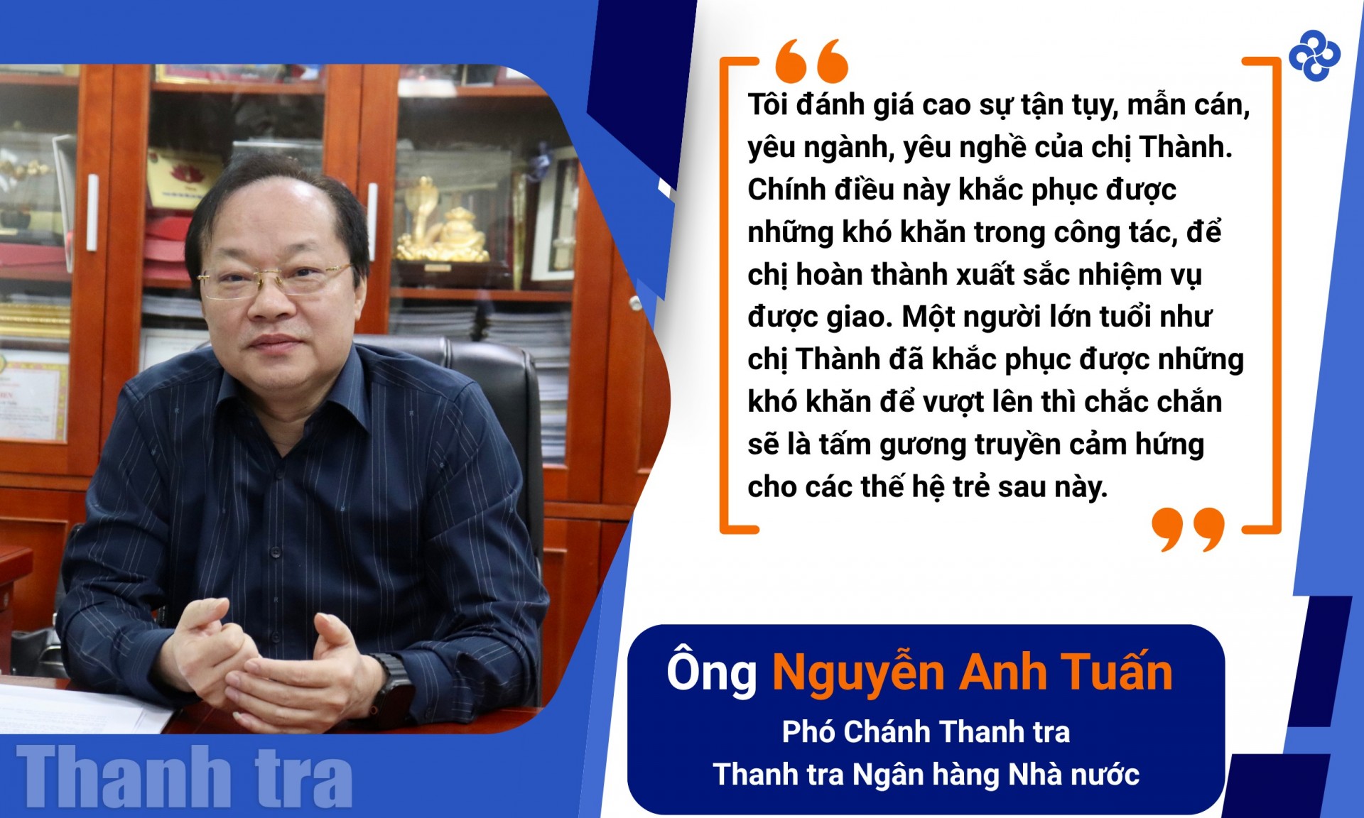 “Tôi thấy chị Thành là người có kinh nghiệm thực tiễn trong công tác thanh tra, giám sát ngân hàng, có khả năng truyền đạt, truyền cảm hứng yêu ngành, yêu nghề đối với đội ngũ cán bộ thanh tra, giám sát ngành Ngân hàng”, ông Nguyễn Anh Tuấn chia sẻ.