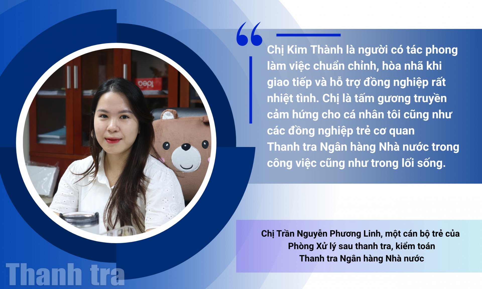 Nhấn mạnh chị Nguyễn Thị Kim Thành là người có thâm niên trong công tác tại cơ quan Thanh tra Ngân hàng Nhà nước, với tư cách là đồng chí, đồng nghiệp, ông Nguyễn Anh Tuấn, Phó Chánh Thanh tra Ngân hàng Nhà nước đánh giá chị Thành là một người có nhiều kinh nghiệm trong công tác chuyên môn. Điểm nổi bật ở chị là ngoài công tác chuyên môn, thực hiện nhiệm vụ cơ quan giao, chị có khả năng tham gia tập huấn, giảng dạy cho đội ngũ cán bộ, công chức trong toàn ngành Ngân hàng. Đặc biệt, đội ngũ thanh tra, giám sát ngân hàng của 63 tỉnh, thành phố (cũ) thường xuyên được chị Thành tập huấn, giảng dạy; trong quá trình công tác thường xuyên trao đổi nghiệp vụ, hỏi những tình huống khó được chị Thành hướng dẫn, giải đáp nhiệt tình, tỉ mỉ.
