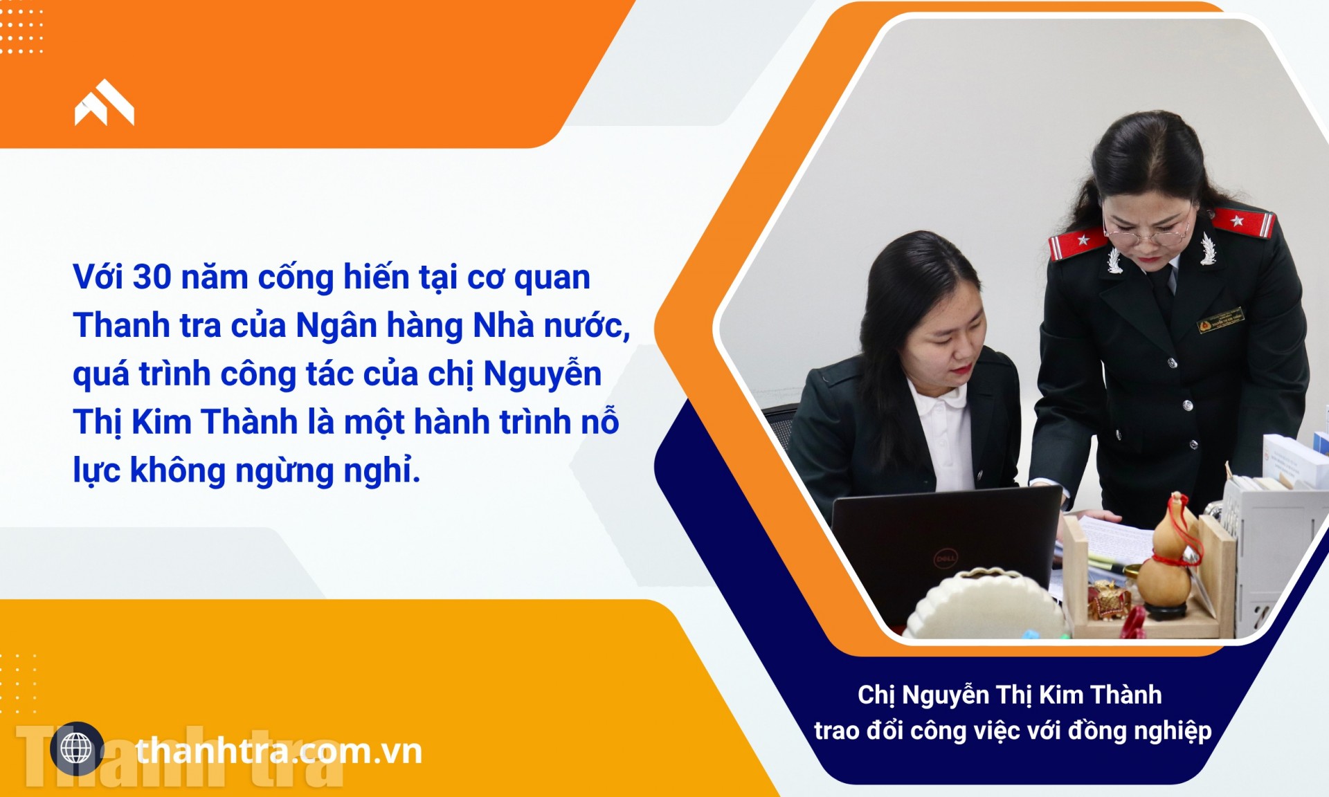Qua 3 thập kỷ, chị đã trải qua nhiều vị trí công tác quan trọng, từ Thanh tra viên, Thanh tra viên chính đến Phó Trưởng phòng Phòng Thanh tra các ngân hàng thương mại do Nhà nước nắm giữ 50% vốn điều lệ, ngân hàng chính sách (Vụ thanh tra các Tổ chức tín dụng trong nước), Phó Trưởng phòng Giám sát hoạt động của đoàn thanh tra (Cục Thanh tra, giám sát ngân hàng I). Hiện tại, chị Nguyễn Thị Kim Thành là Thanh tra viên chính, Phòng Xử lý sau thanh tra, kiểm toán, Thanh tra Ngân hàng Nhà nước.
