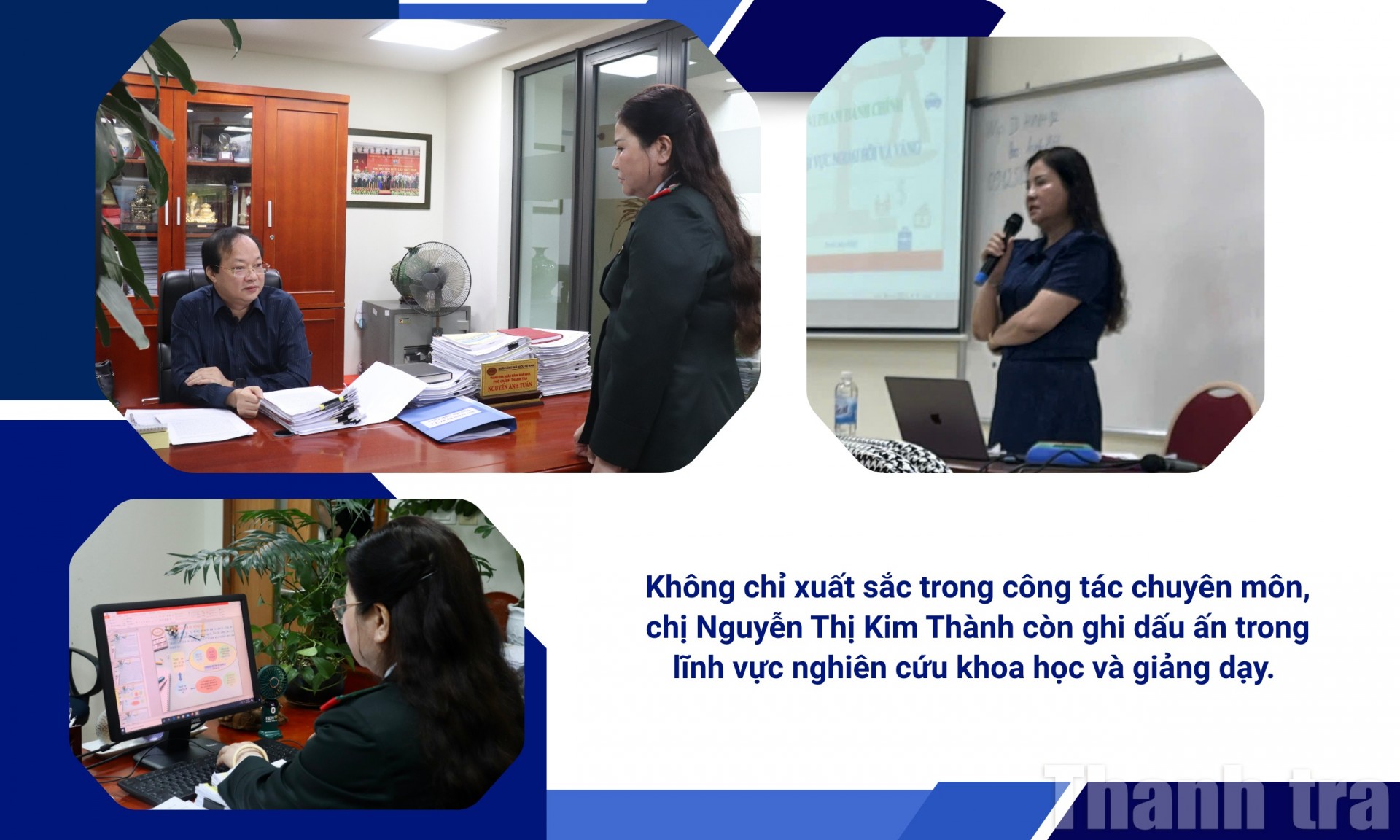 Không chỉ xuất sắc trong công tác chuyên môn, chị Nguyễn Thị Kim Thành còn ghi dấu ấn trong lĩnh vực nghiên cứu khoa học và giảng dạy. Chị là chủ nhiệm đề tài nghiên cứu khoa học “Thẩm định dự thảo Kết luận thanh tra trong lĩnh vực ngân hàng - Thực trạng và giải pháp”, được nghiệm thu hoàn thành ngày 19/12/2023. Đề tài nhằm khắc phục hạn chế, sai sót trong quá trình thanh tra, giám sát và xử lý vi phạm hành chính, giảm thiểu rủi ro pháp lý cho người ra quyết định thanh tra và ban hành kết luận thanh tra.